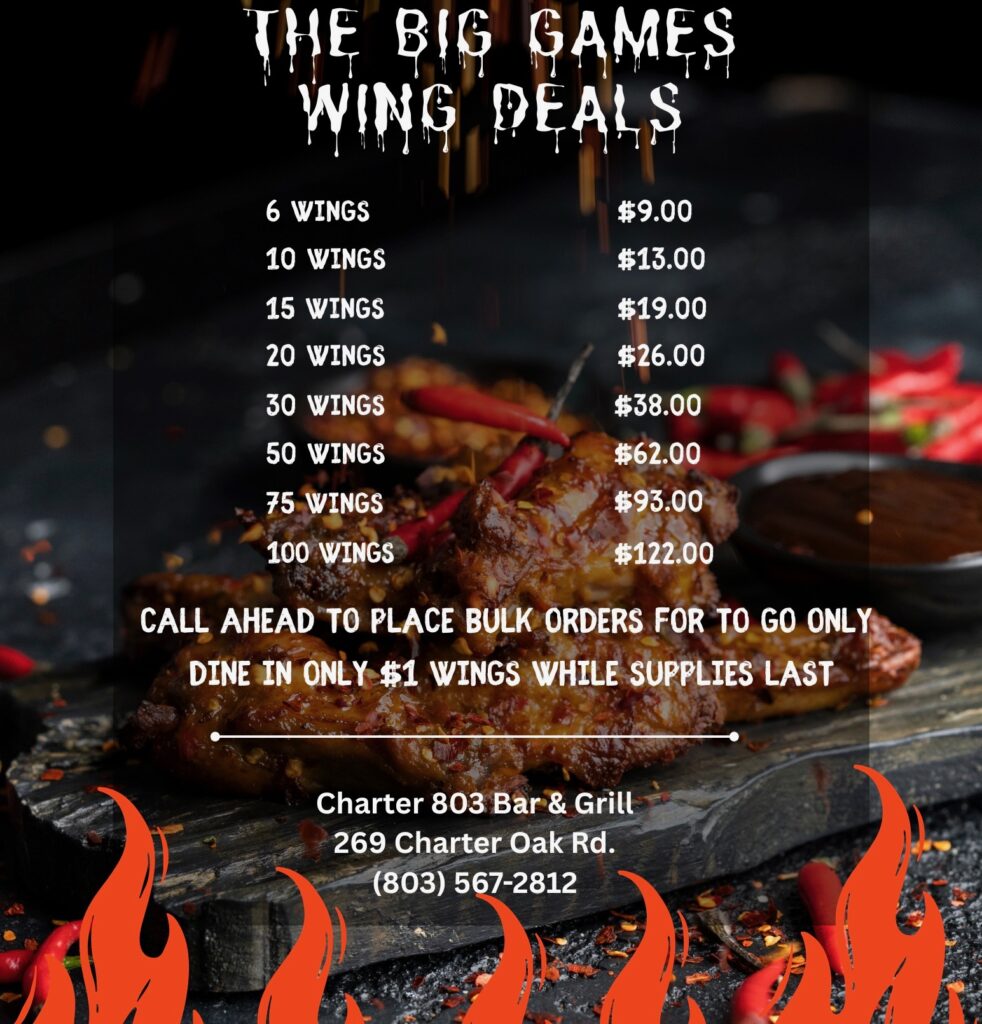 Wing Sauces: Garlic Parmesan- Buffalo- Teriyaki-Teri Hot- Sweet Bold BBQ- Cajun Dry Rub- Nashville Hot- Lemon Pepper – Sweet Heat – Honey BBQ